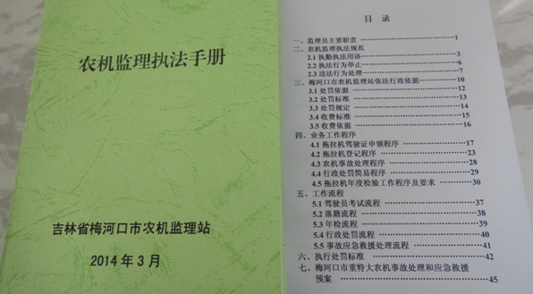 为进一步规范农机监理行政行为,切实改进农机监理执法人员的工作作风,提高农机监理依法行政、文明执法水平。日前,由梅河口市农机监理站组织汇编的《农机监理执法手册》制作完成。