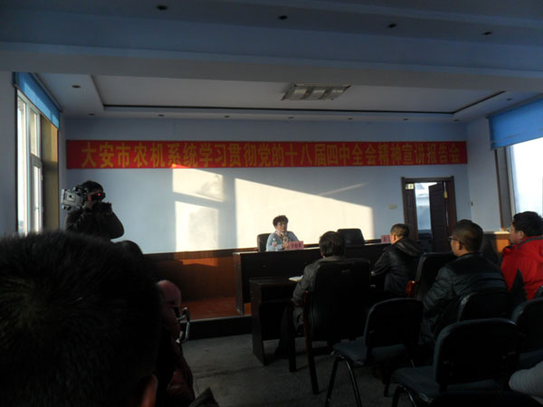 12月19日,大安市农机局召开党的十八届四中全精神宣讲报告会,邀请市党校经济管理教研室于桂荣教授做专题宣讲辅导。
